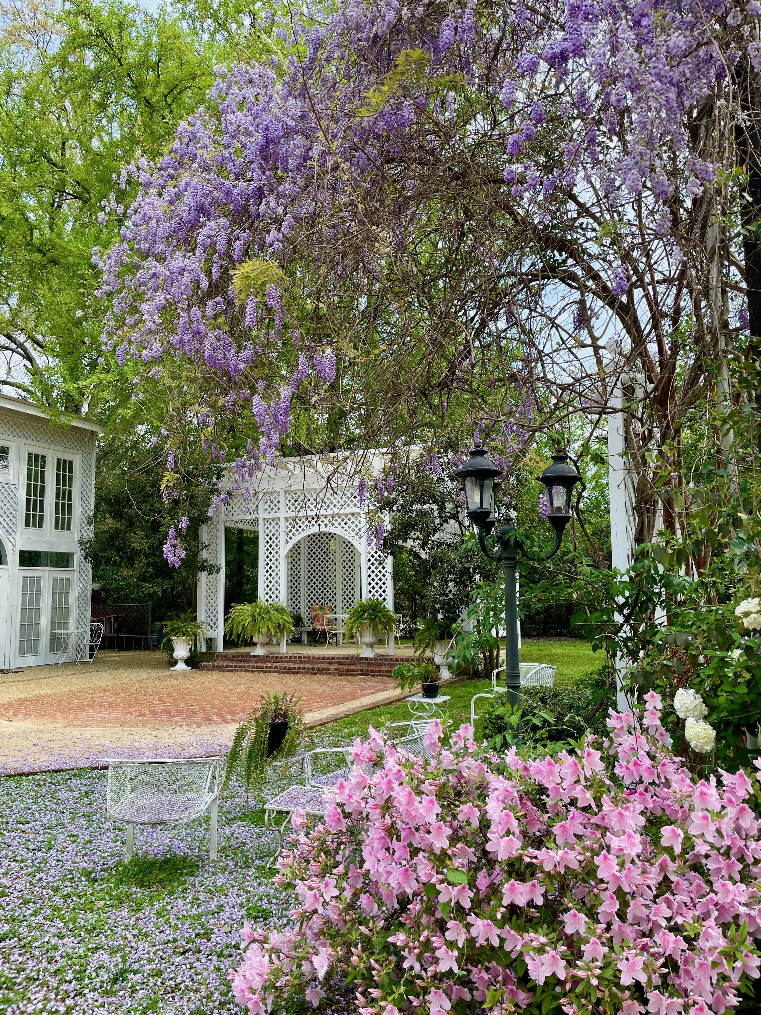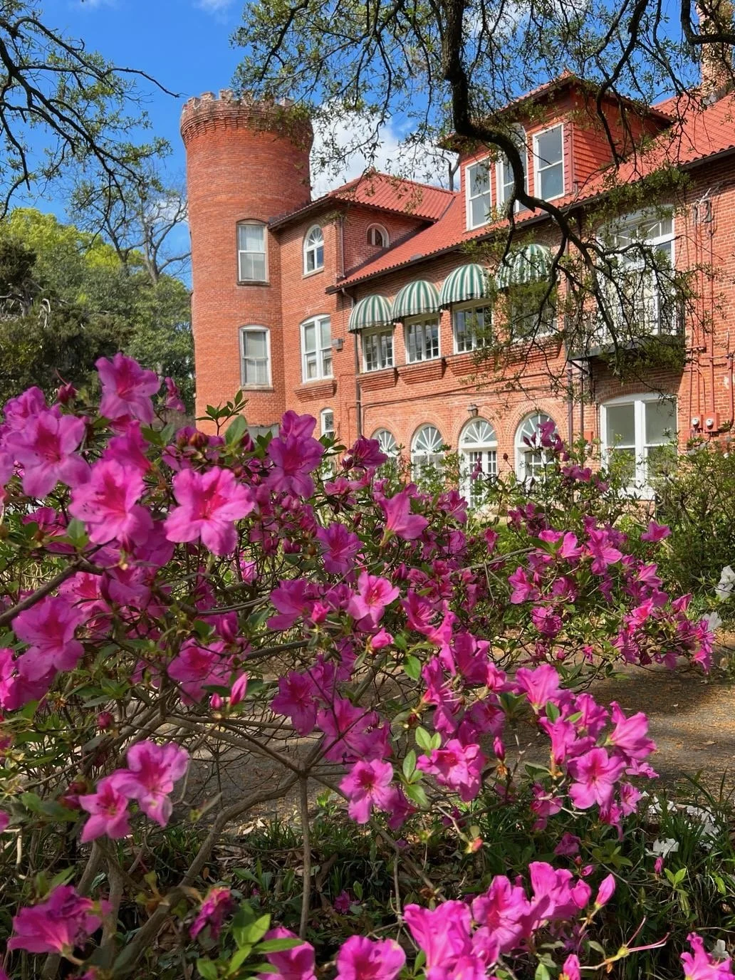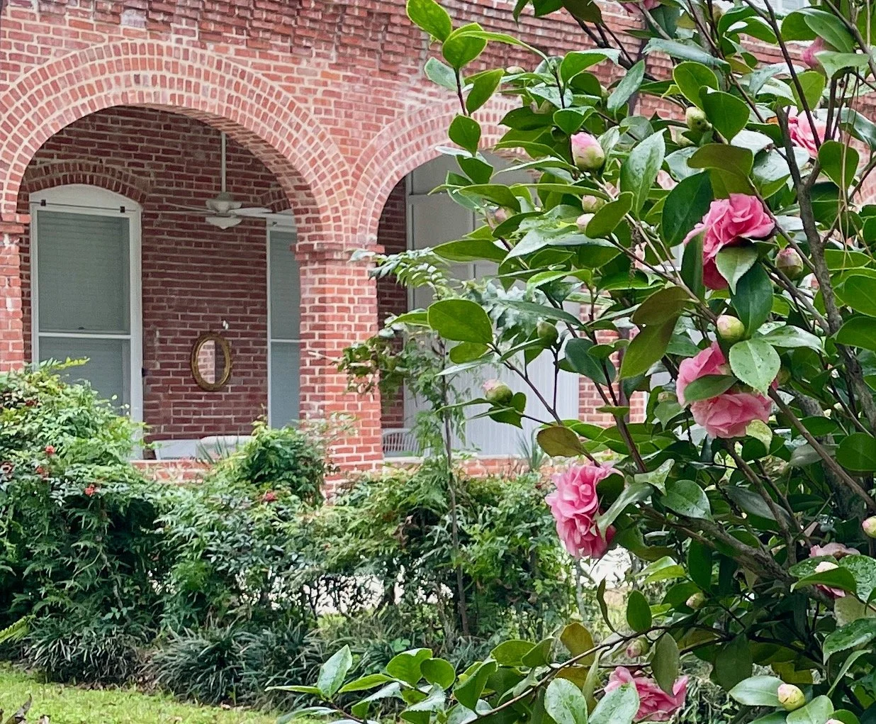 Our picturesque building sits on 5 acres full of ancient live oaks, magnolias, pecan trees and crepe myrtles, as well as over 40 camellias. There are several beautiful places to consider holding your event on the grounds.